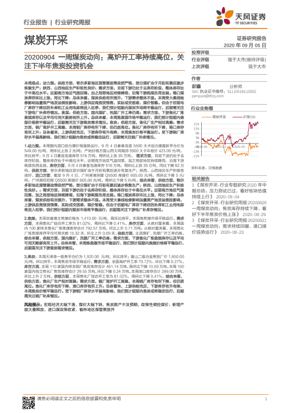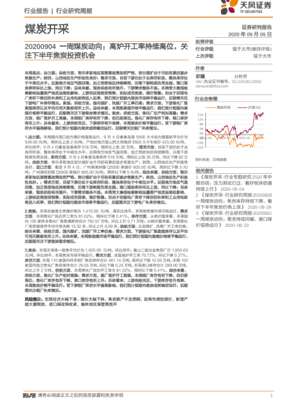 【天风证券】【20200905】20200905-天风证券-一周煤炭动向:高炉开工率持续高位,关注下半年焦炭投资机会-19页