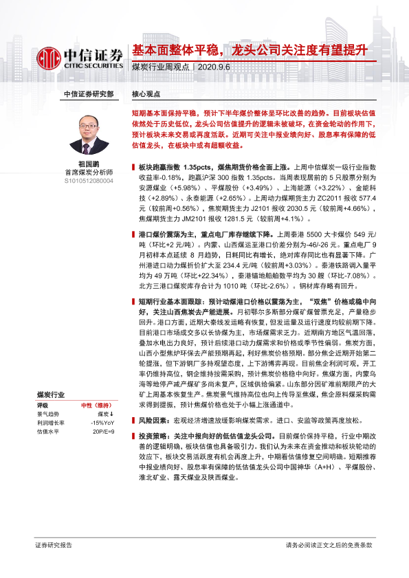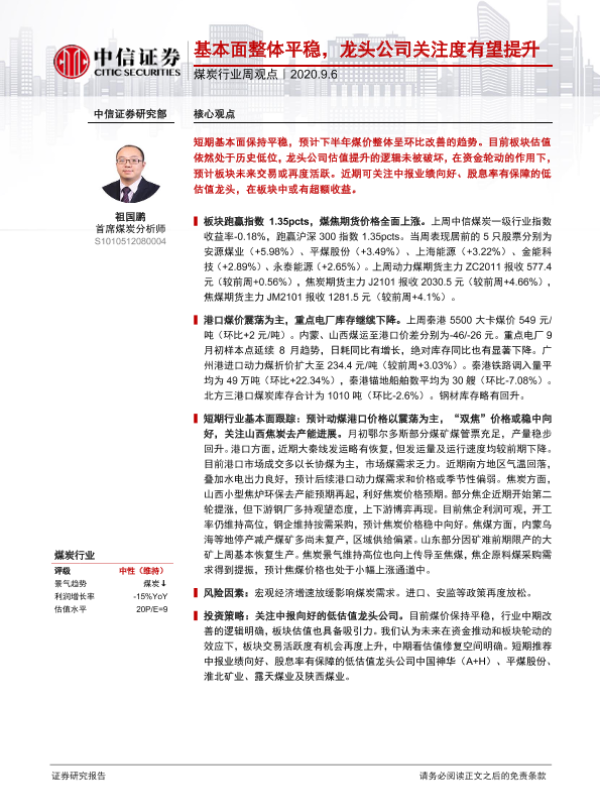 【中信证券】【20200906】煤炭行业周观点:基本面整体平稳,龙头公司关注度有望提升-7页
