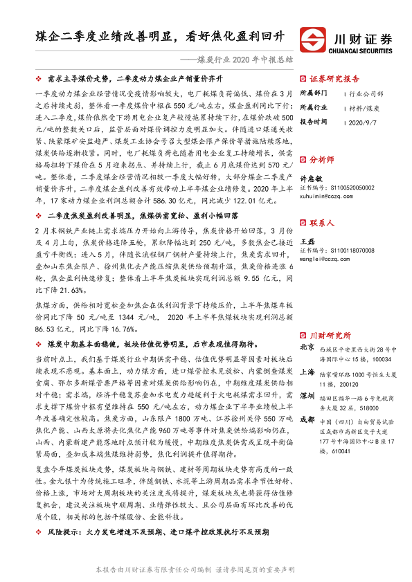 【川财证券】【20200907】煤炭行业2020年中报总结:煤企二季度业绩改善明显,看好焦化盈利回升-19页
