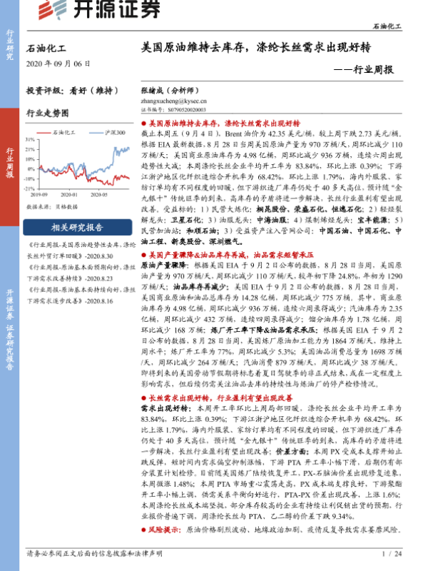 【开源证券】【20200906】石油化工行业周报:美国原油维持去库存,涤纶长丝需求出现好转-24页