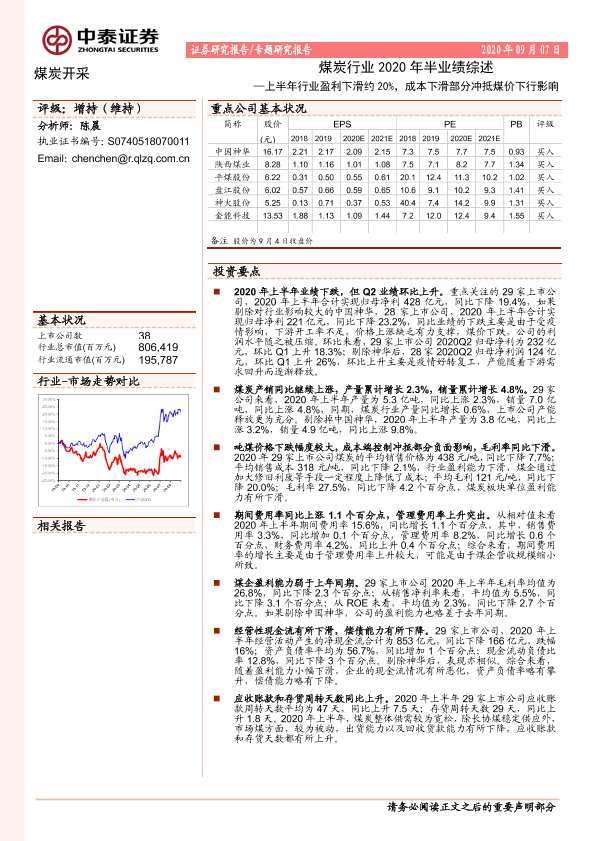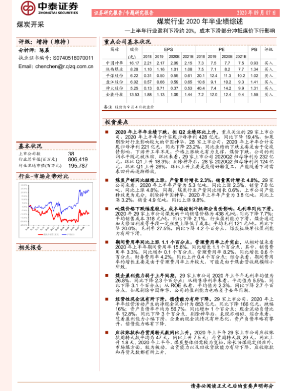 【中泰证券】【20200907】煤炭行业2020年半业绩综述:上半年行业盈利下滑约20%,成本下滑部分冲抵煤价下行影响-21页