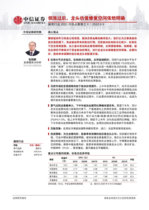 【中信证券】【20200909】煤炭行业2020年热点聚焦之十:领涨过后,龙头估值修复空间依然明确-6页
