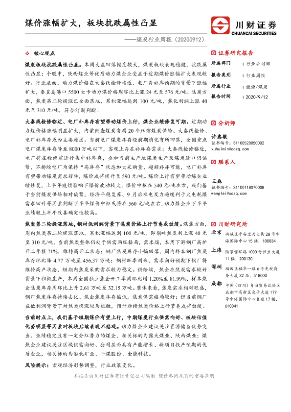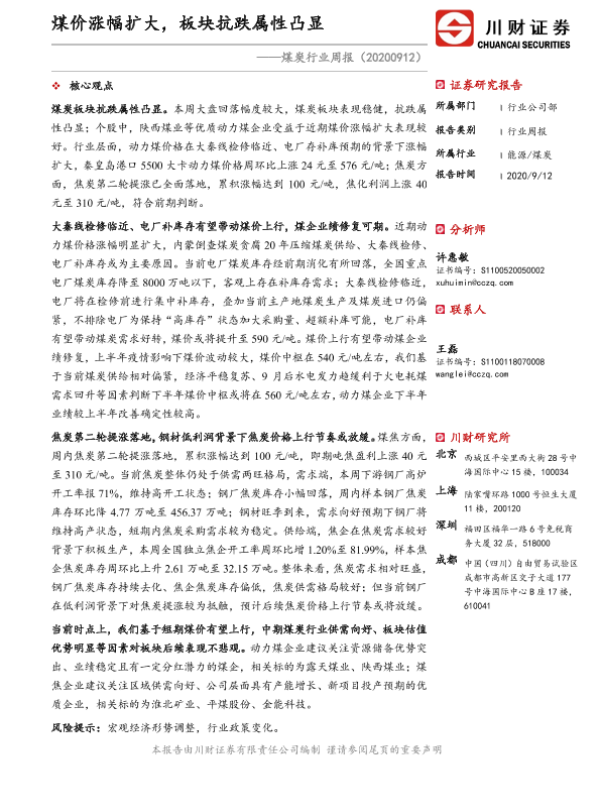 【川财证券】【20200912】20200912-川财证券-煤炭行业周报:煤价涨幅扩大,板块抗跌属性凸显-12页