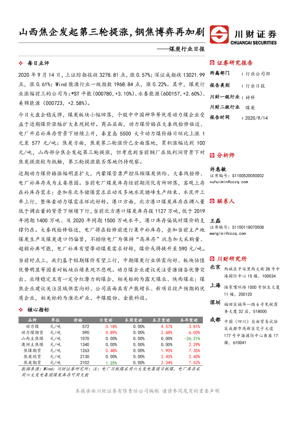 【川财证券】【20200914】煤炭行业日报:山西焦企发起第三轮提涨,钢焦博弈再加剧-3页