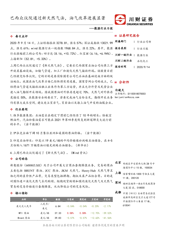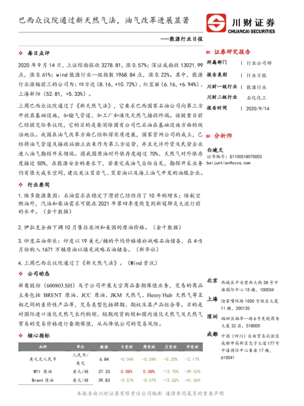 【川财证券】【20200914】能源行业日报:巴西众议院通过新天然气法,油气改革进展显著-3页