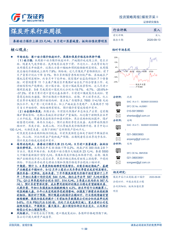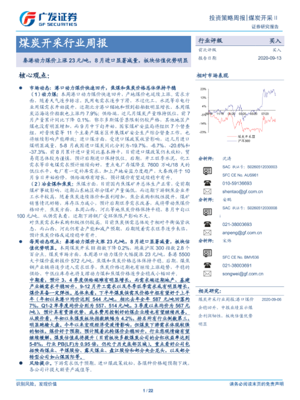【广发证券】【20200913】20200913-广发证券-煤炭开采行业周报:秦港动力煤价上涨23元 吨,8月进口显著减量,板块估值优势明显-22页