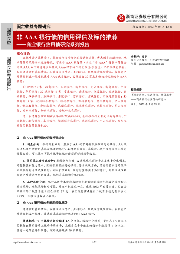 【浙商证券】【20220612】非AAA银行债的信用评估及标的推荐-22页