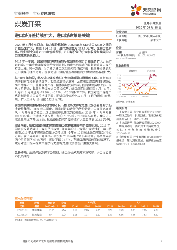【天风证券】【20200918】煤炭开采行业专题研究:进口煤价差持续扩大,进口煤政策是关键-9页