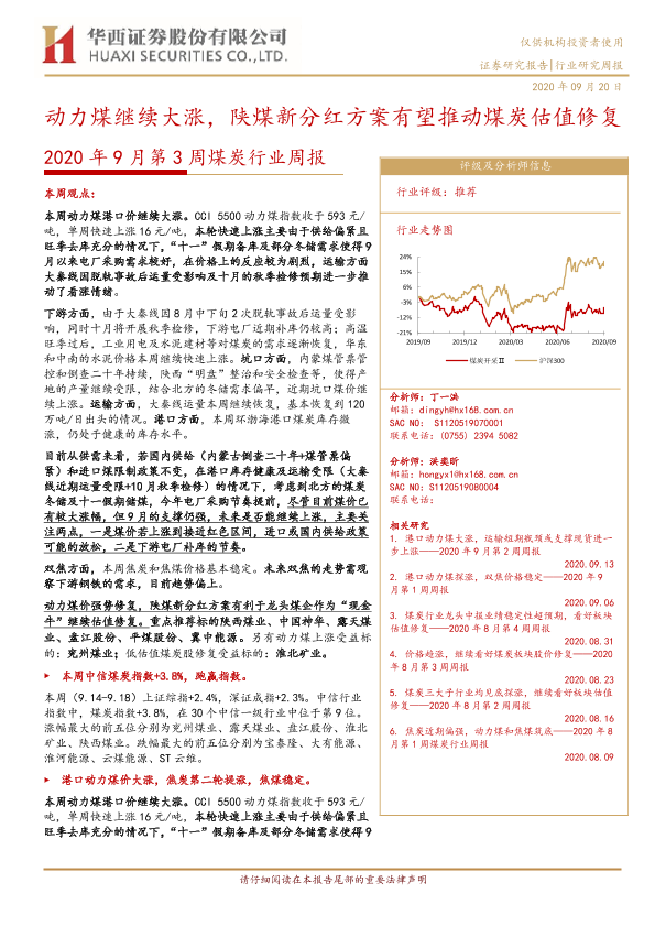 【华西证券】【20200920】2020年9月第3周煤炭行业周报:动力煤继续大涨,陕煤新分红方案有望推动煤炭估值修复-22页