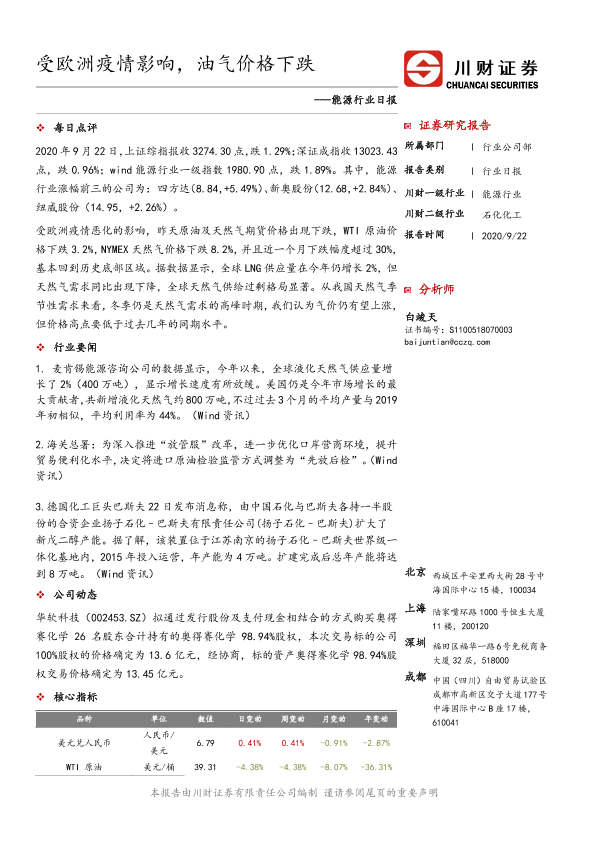 【川财证券】【20200922】能源行业日报:受欧洲疫情影响,油气价格下跌-3页