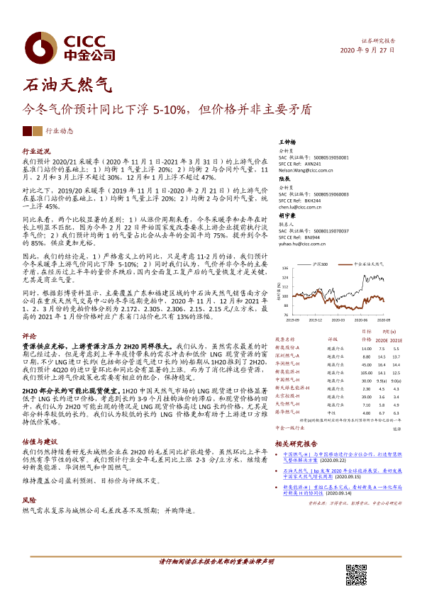 【中金公司】【20200927】石油天然气:今冬气价预计同比下浮5-10%,但价格并非主要矛盾-5页