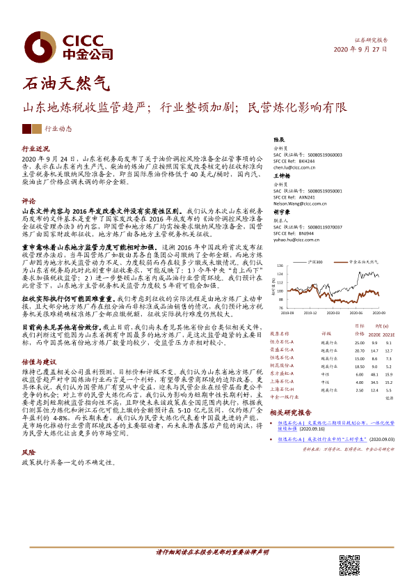 【中金公司】【20200927】石油天然气:山东地炼税收监管趋严;行业整顿加剧;民营炼化影响有限-5页