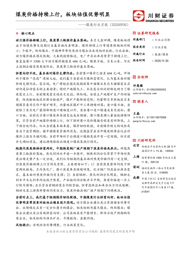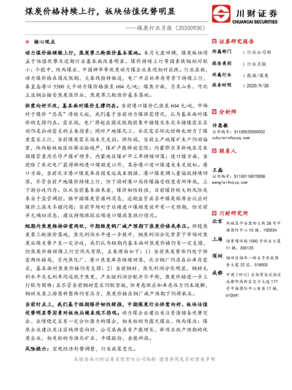 【川财证券】【20200930】20200930-川财证券-煤炭行业月报:煤炭价格持续上行,板块估值优势明显-12页