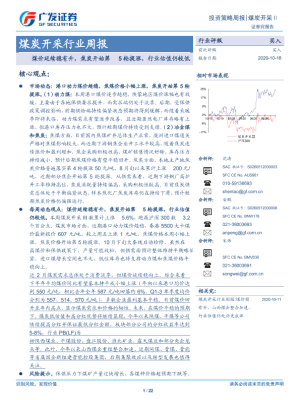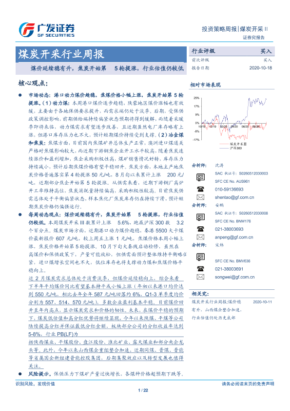 【广发证券】【20201018】20201018-广发证券-煤炭开采行业周报:煤价延续稳有升,焦炭开始第5轮提涨,行业估值仍较低-22页