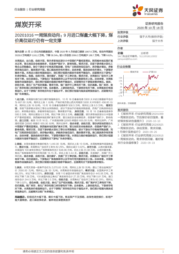 【天风证券】【20201018】20201018-天风证券-一周煤炭动向:9月进口煤量大幅下降,煤价高位运行仍有一定支撑-19页