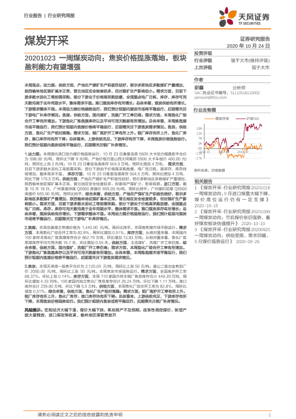 【天风证券】【20201024】20201024-天风证券-一周煤炭动向:焦炭价格提涨落地,板块盈利能力有望增强-19页