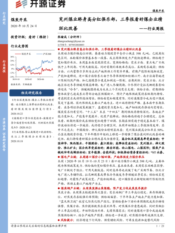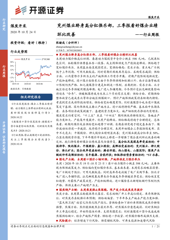 【开源证券】【20201024】20201024-开源证券-煤炭开采行业周报:兖州煤业跻身高分红俱乐部,三季报看好煤企业绩环比改善-21页