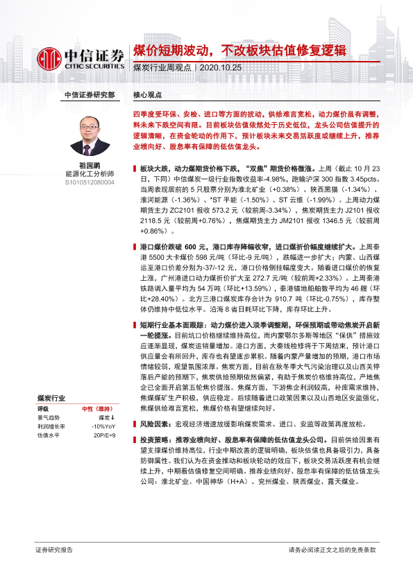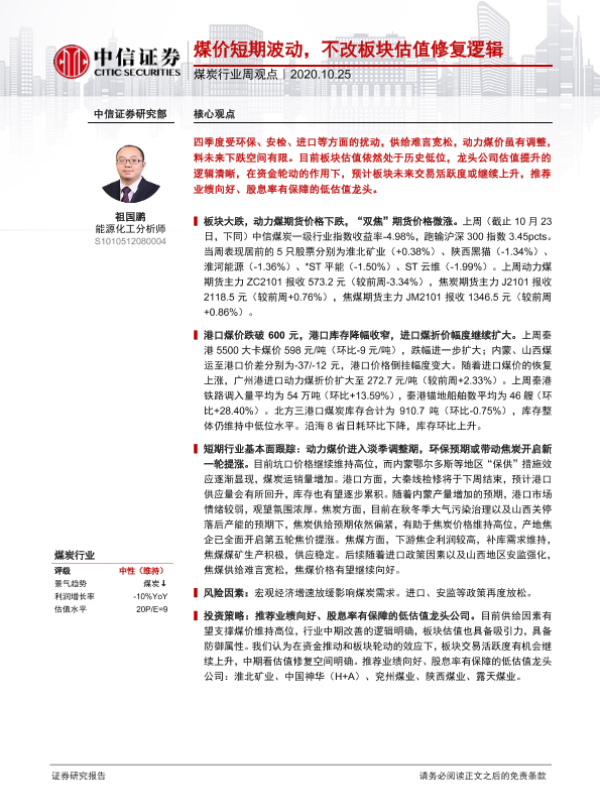 【中信证券】【20201025】20201025-中信证券-煤炭行业周观点:煤价短期波动,不改板块估值修复逻辑-8页