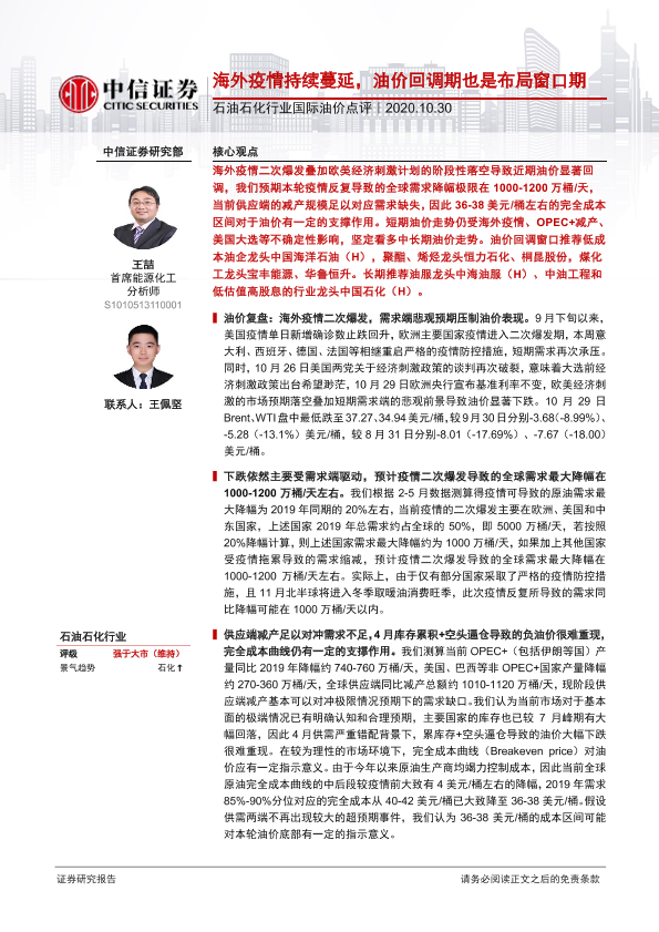 【中信证券】【20201030】石油石化行业国际油价点评:海外疫情持续蔓延,油价回调期也是布局窗口期-5页