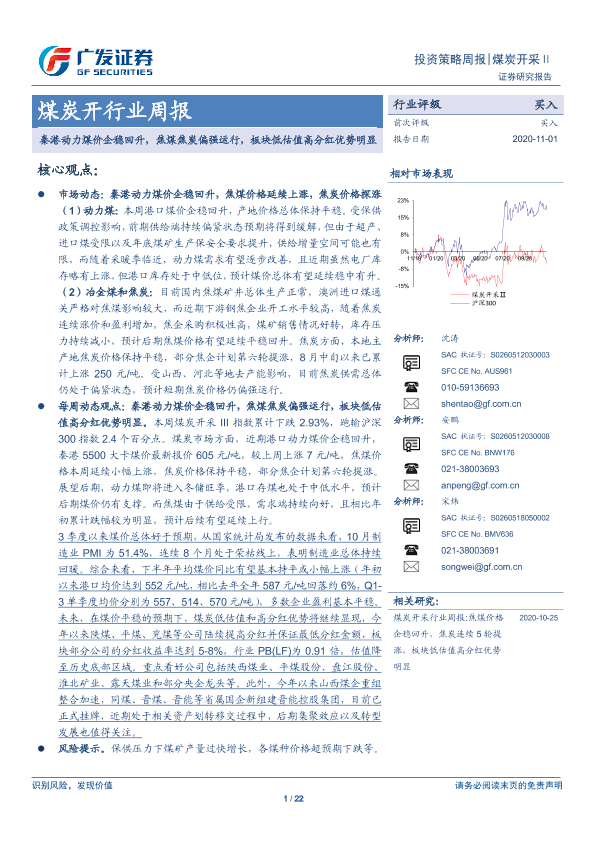 【广发证券】【20201101】20201101-广发证券-煤炭开行业周报:秦港动力煤价企稳回升,焦煤焦炭偏强运行,板块低估值高分红优势明显-22页
