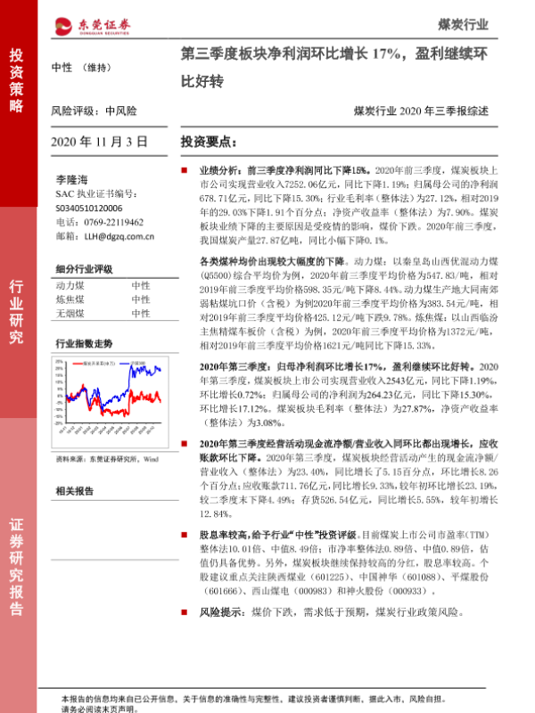 【东莞证券】【20201103】煤炭行业2020年三季报综述:第三季度板块净利润环比增长17%,盈利继续环比好转-10页