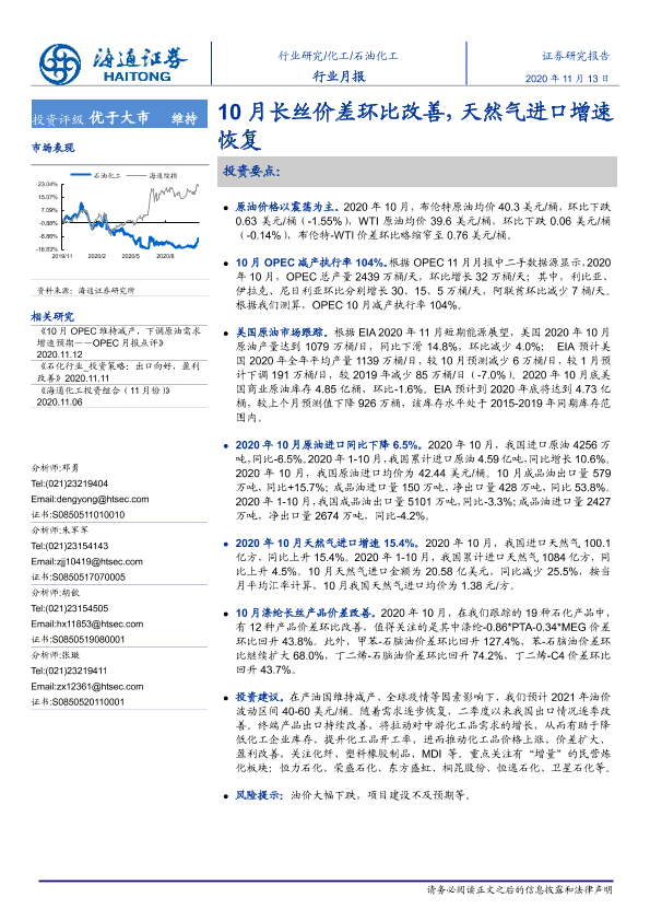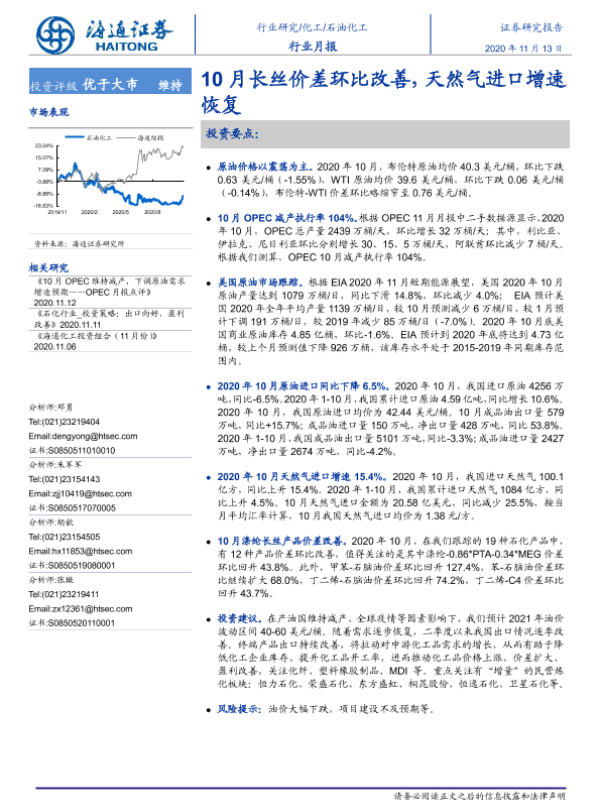【海通证券】【20201113】20201113-海通证券-石油化工行业月报:10月长丝价差环比改善,天然气进口增速恢复-7页