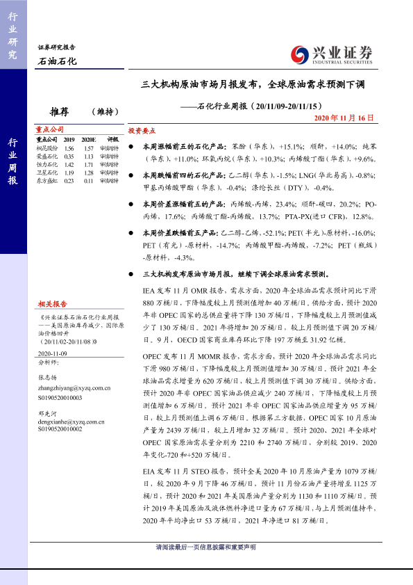 【兴业证券】【20201117】20201117-兴业证券-石化行业周报:三大机构原油市场月报发布,全球原油需求预测下调-14页