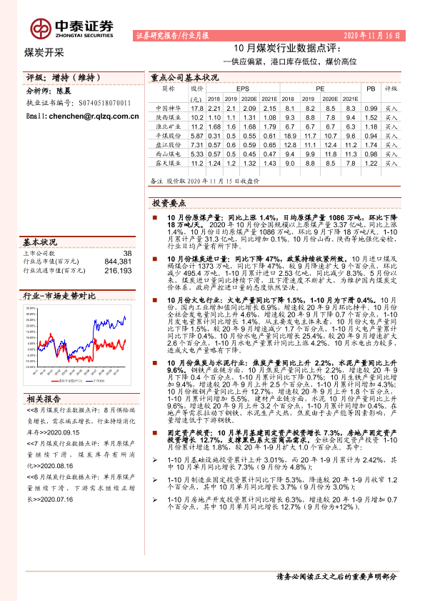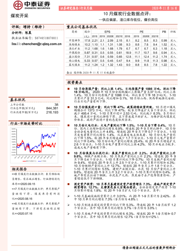 【中泰证券】【20201116】10月煤炭行业数据点评:供应偏紧,港口库存低位,煤价高位-6页