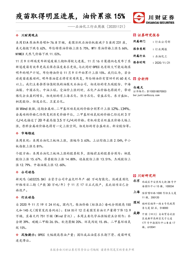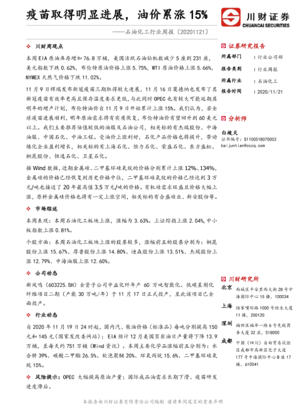 【川财证券】【20201121】20201121-川财证券-石油化工行业周报:疫苗取得明显进展,油价累涨15%-12页