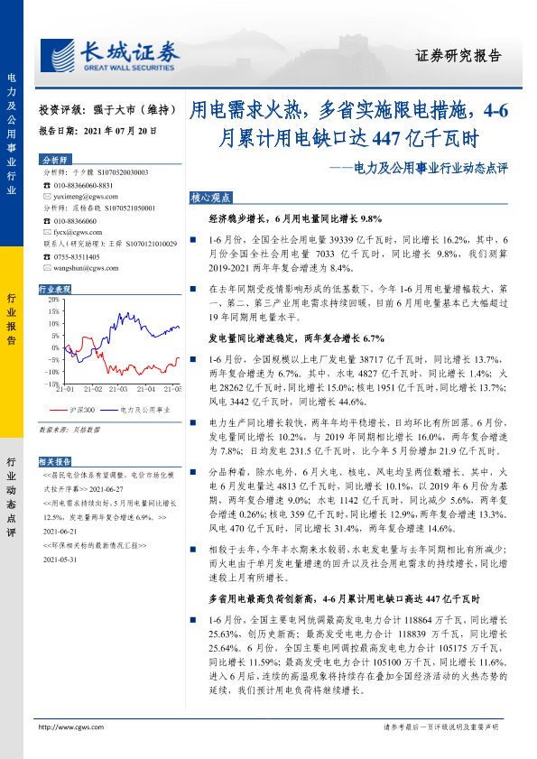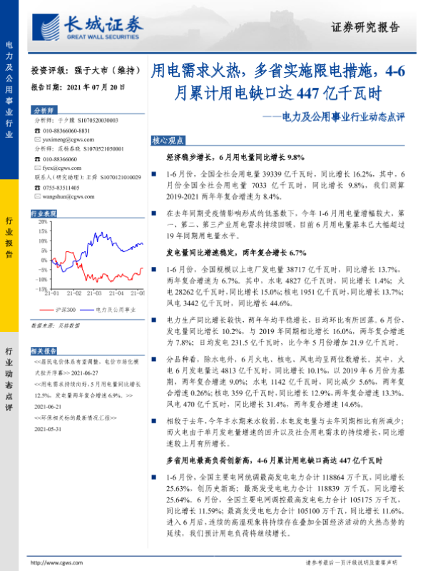 【长城证券】【20210720】电力及公用事业行业动态点评:用电需求火热,多省实施限电措施,4~6月累计用电缺口达447亿千瓦时-13页