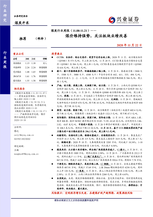 【兴业证券】【20201122】煤炭行业周报(11.08-11.21)——煤价维持强势,关注板块业绩改善-13页