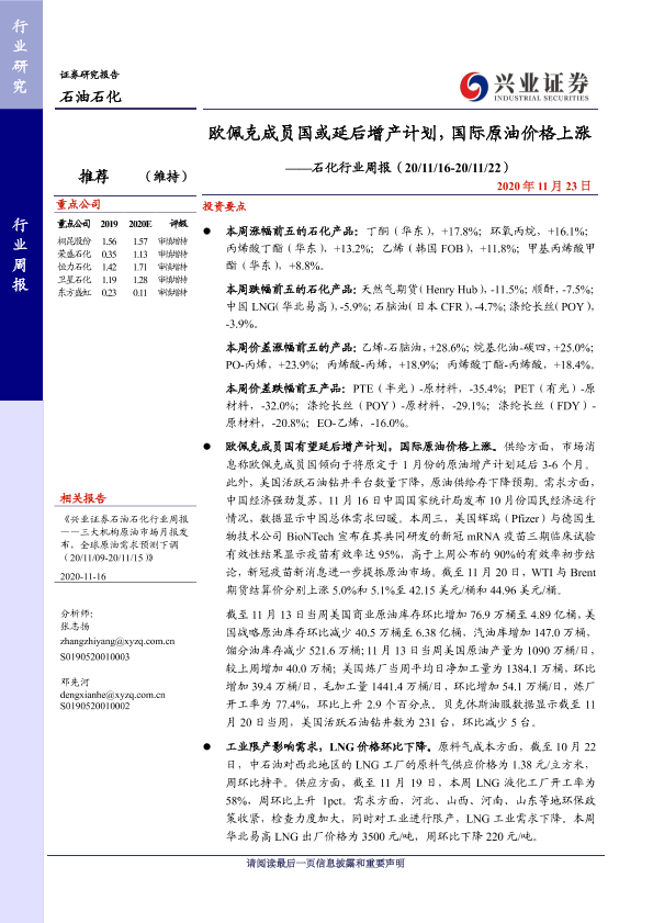 【兴业证券】【20201123】20201123-兴业证券-石化行业周报:欧佩克成员国或延后增产计划,国际原油价格上涨-13页