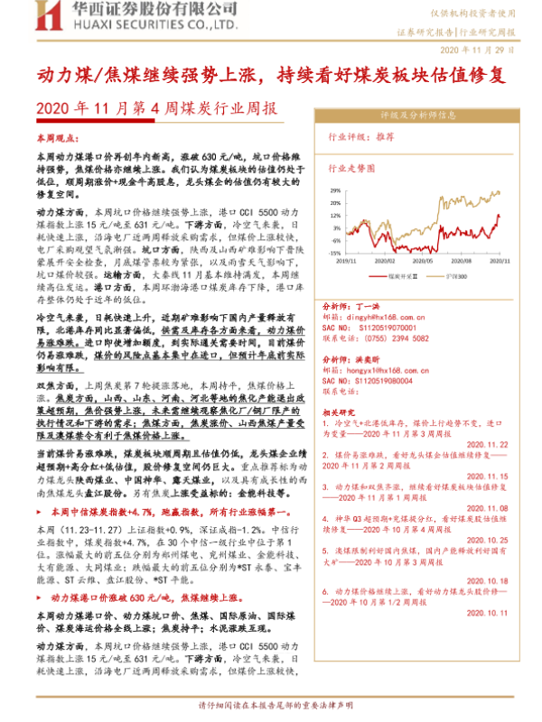 【华西证券】【20201129】2020年11月第4周煤炭行业周报:动力煤 焦煤继续强势上涨,持续看好煤炭板块估值修复-22页