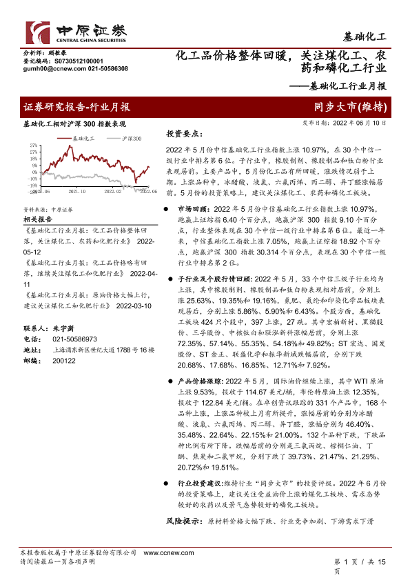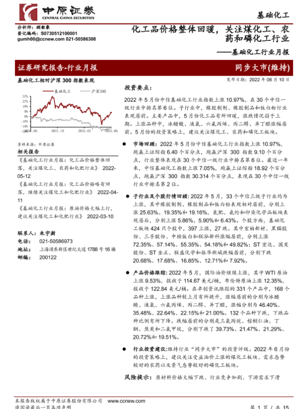 【中原证券】【20220610】基础化工行业月报:化工品价格整体回暖,关注煤化工、农药和磷化工行业-15页