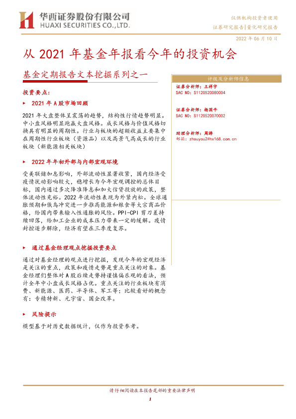 【华西证券】【20220610】基金定期报告文本挖掘系列之一:从2021年基金年报看今年的投资机会-22页