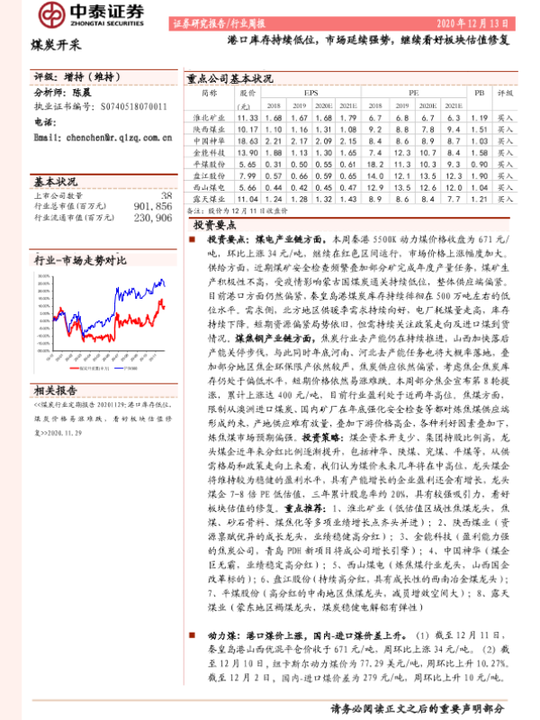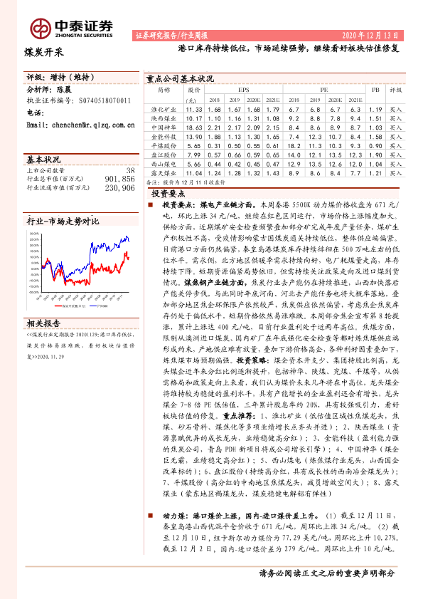 【中泰证券】【20201213】20201213-中泰证券-煤炭开采行业周报:港口库存持续低位,市场延续强势,继续看好板块估值修复-16页