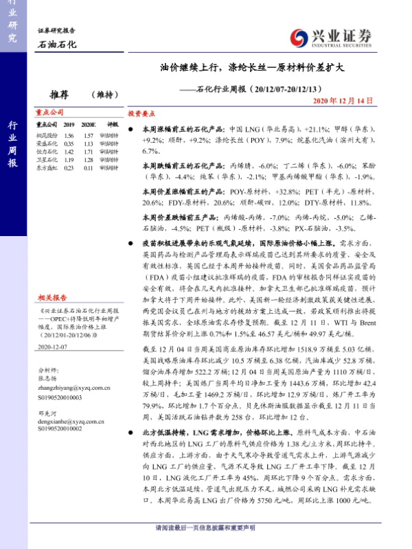 【兴业证券】【20201214】20201214-兴业证券-石化行业周报:油价继续上行,涤纶长丝—原材料价差扩大-13页