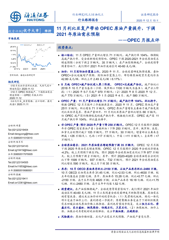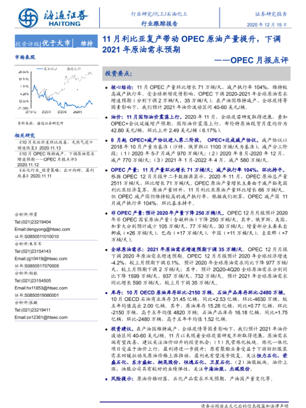 【海通证券】【20201215】石油化行业:OPEC月报点评-1月利比亚复产带动OPEC原油产量提升,下调2021年原油需求预期-5页