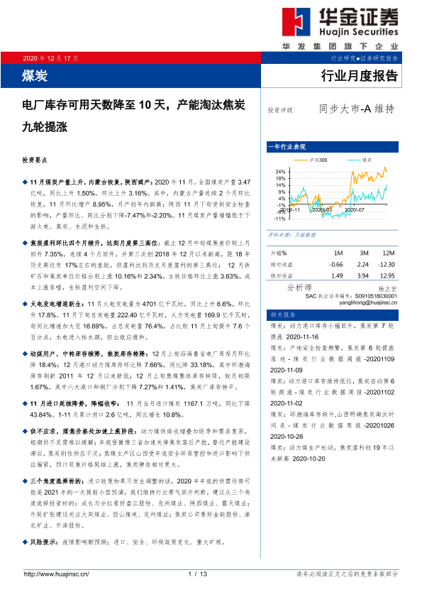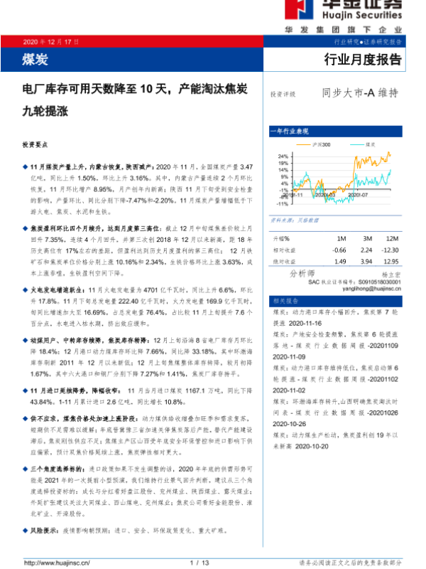 【华金证券】【20201217】20201217-华金证券-煤炭行业月度报告:电厂库存可用天数降至10天,产能淘汰焦炭九轮提涨-13页