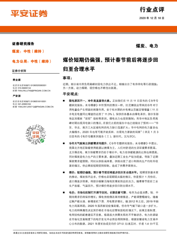【平安证券】【20201218】煤炭、电力行业点评:煤价短期仍偏强,预计春节前后将逐步回归至合理水平-3页