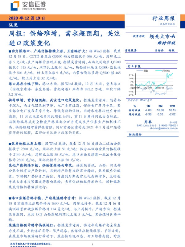 【安信证券】【20201219】20201219-安信证券-煤炭周报:供给难增,需求超预期,关注进口政策变化-23页