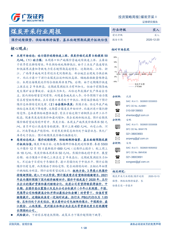 【广发证券】【20201220】20201220-广发证券-煤炭开采行业周报:煤价延续强势,供给端维持偏紧,基本面超预期或提升板块估值-22页