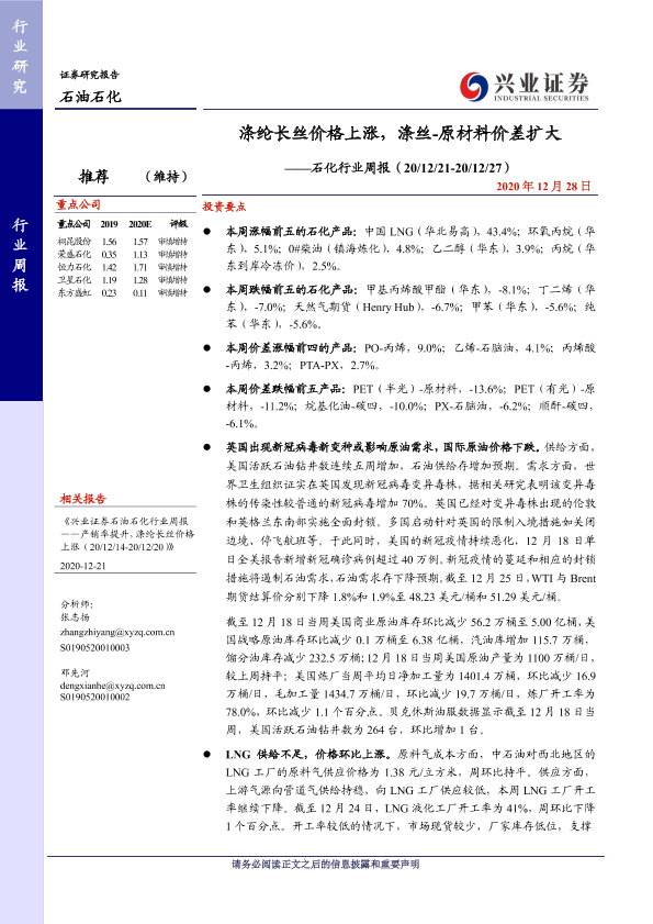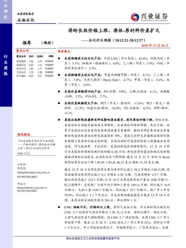 【兴业证券】【20201228】20201228-兴业证券-石化行业周报:涤纶长丝价格上涨,涤丝-原材料价差扩大-13页