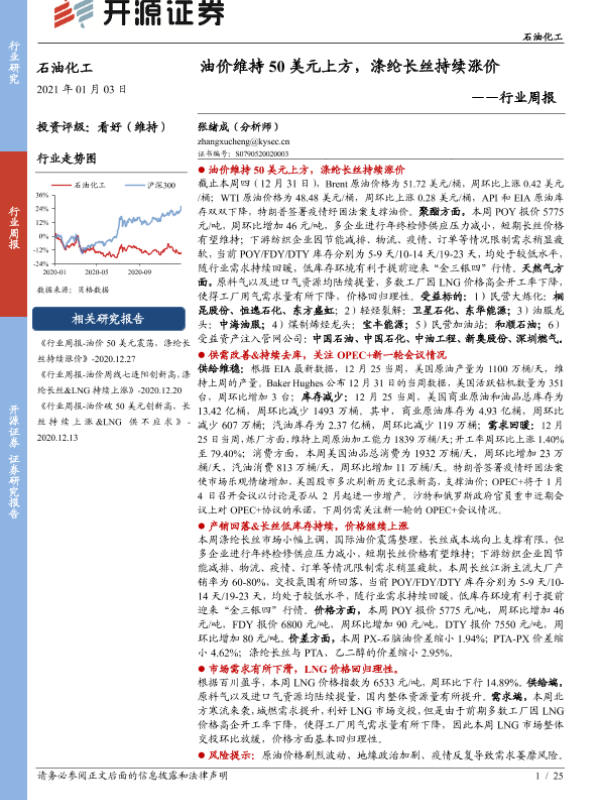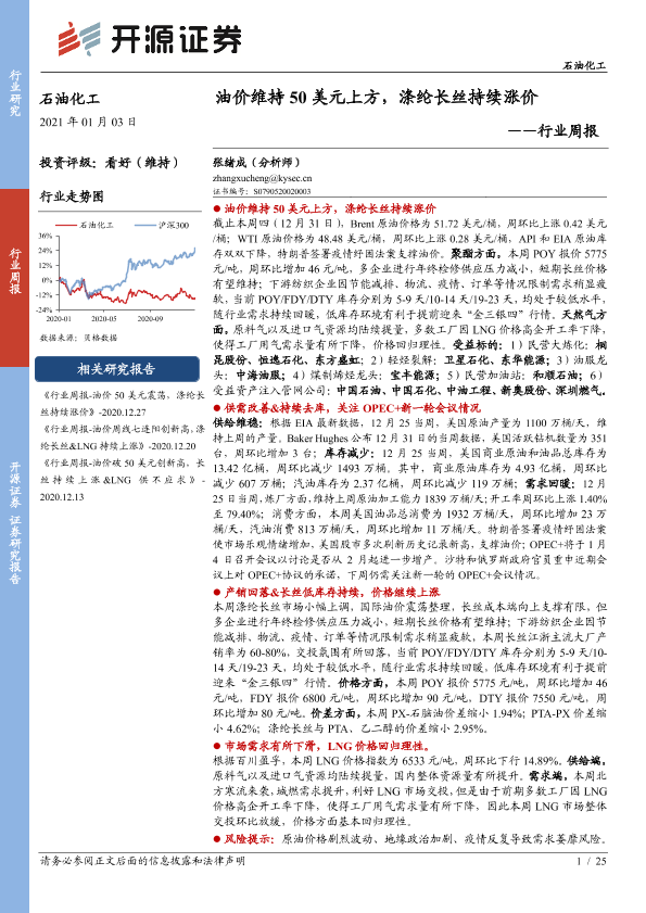【开源证券】【20210103】20210103-开源证券-石油化工行业周报:油价维持50美元上方,涤纶长丝持续涨价-25页