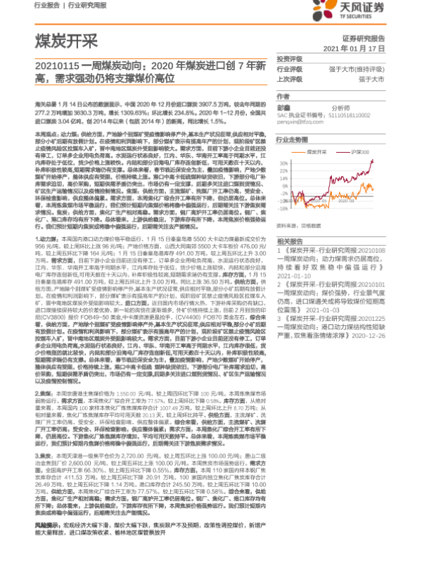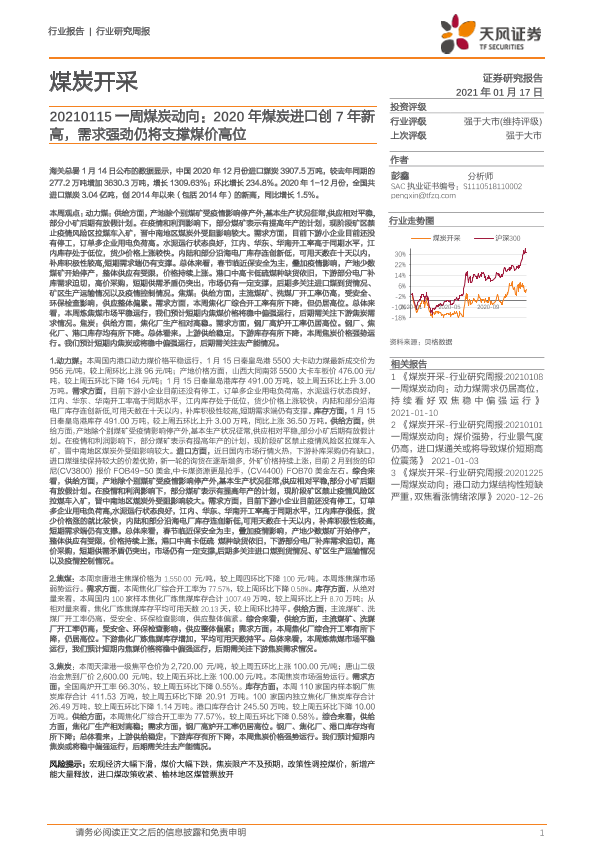 【天风证券】【20210117】20210117-天风证券-煤炭开采一周煤炭动向:2020年煤炭进口创7年新高,需求强劲仍将支撑煤价高位-19页