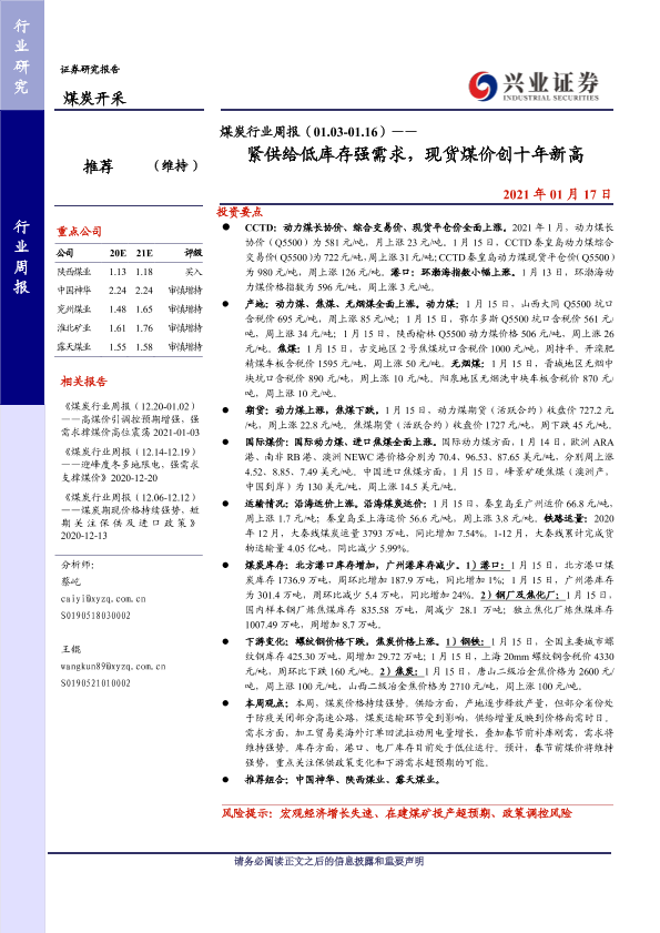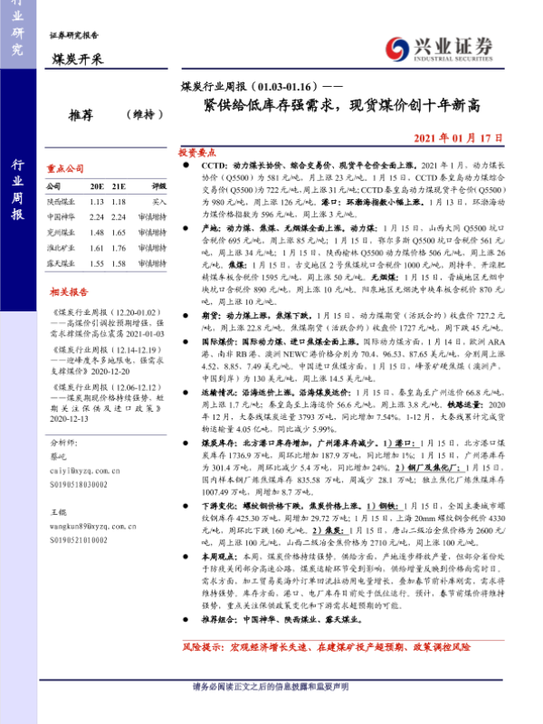 【兴业证券】【20210117】煤炭行业周报(01.03-01.16)——紧供给低库存强需求,现货煤价创十年新高-13页