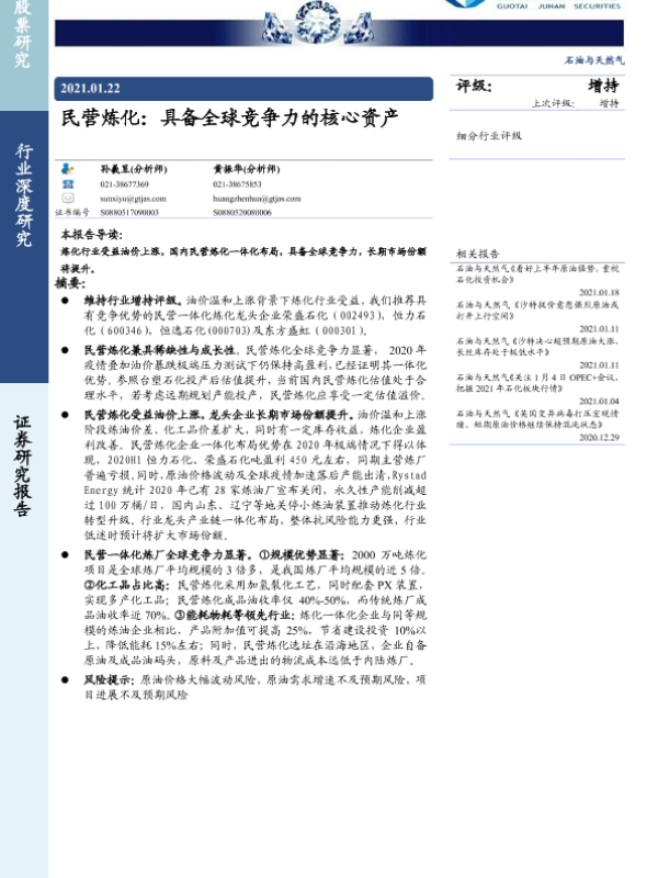 【国泰君安证券】【20210122】民营炼化:具备全球竞争力的核心资产-15页