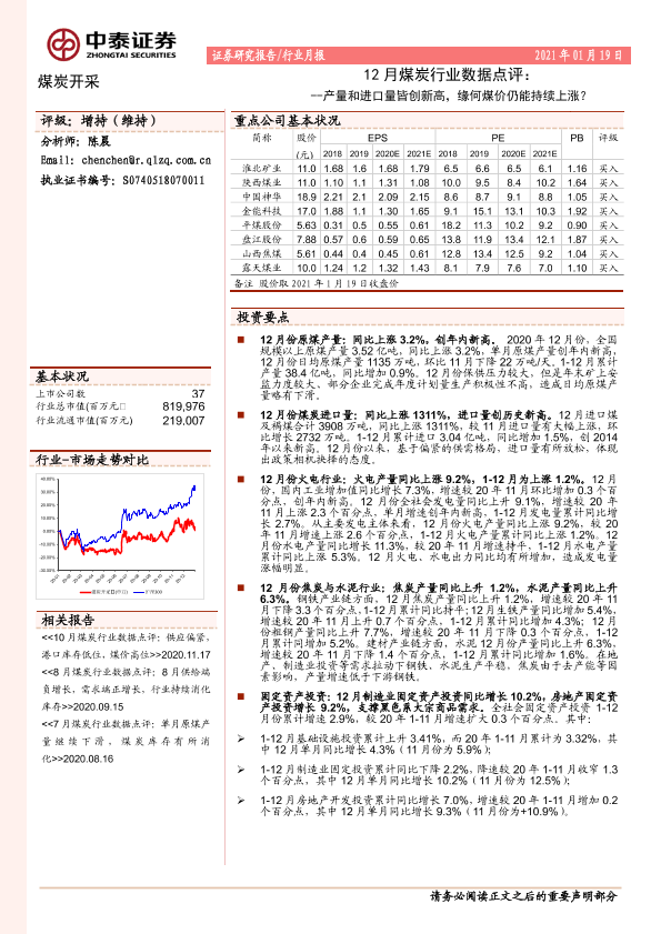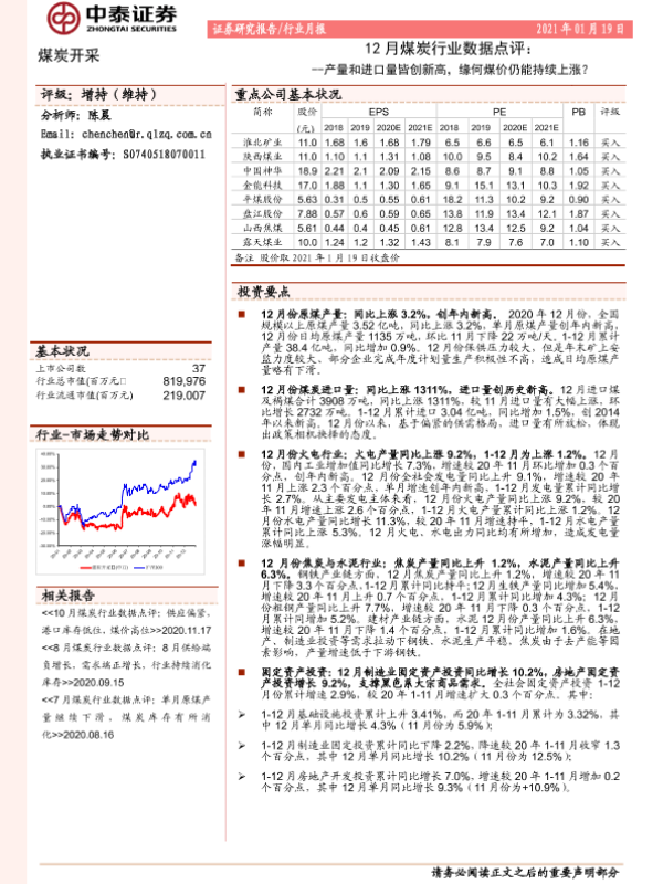 【中泰证券】【20210119】12月煤炭行业数据点评:产量和进口量皆创新高,缘何煤价仍能持续上涨?-5页