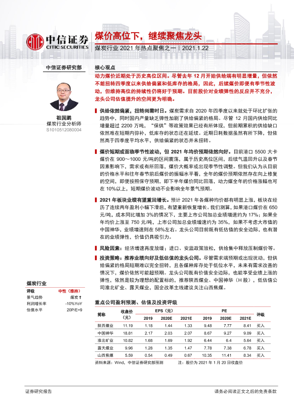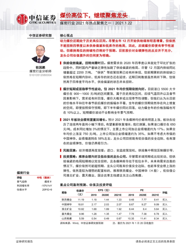 【中信证券】【20210122】煤炭行业2021年热点聚焦之一:煤价高位下,继续聚焦龙头-17页