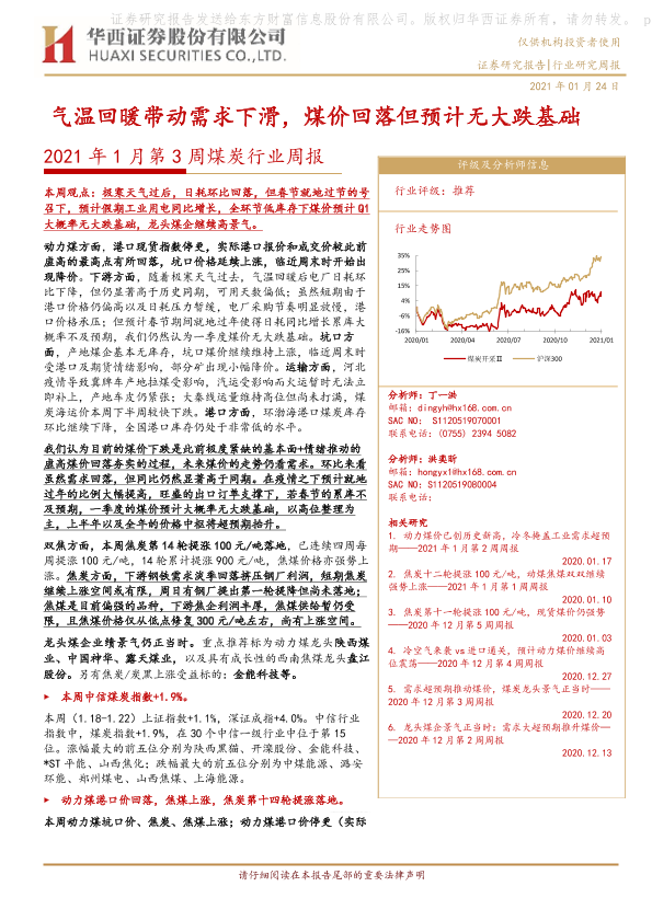 【华西证券】【20210124】2021年1月第3周煤炭行业周报:气温回暖带动需求下滑,煤价回落但预计无大跌基础-22页